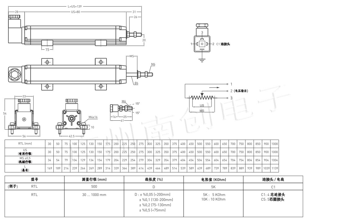 ZZP廣州南創電子科技有限公司電阻式線性位移傳感器帶內置轉換模塊系列:ELPT、ELPH、ELPC、ELPM
