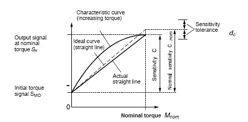 靈敏度C被表示為特性曲線的斜率。特性曲線為連接未加載的扭矩傳感器的輸出信號(hào)SM0和額定扭矩輸出信號(hào)Sn之間的直線。簡(jiǎn)單表達(dá)式為