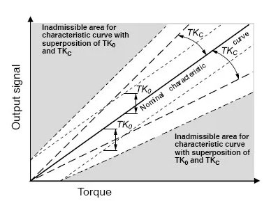 對(duì)于1kNm的扭矩(額定扭矩),這相當(dāng)于1N⋅m。但是,對(duì)于200Nm的扭矩,偏差僅為0.2N⋅m,因?yàn)門KC始終是指實(shí)際輸出信號(hào)的百分比偏差,這是因?yàn)殪`敏度基于的是直線斜率。在43°C(與額定溫度相差20K)下使用相同的傳感器,在最壞的情況下,可能導(dǎo)致最大偏差高達(dá)0.2%。并且不適用于在3°C下使用,因?yàn)樵摐囟炔辉陬~定溫度范圍內(nèi)。
