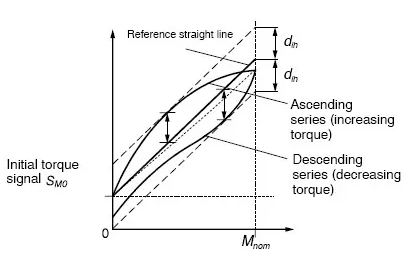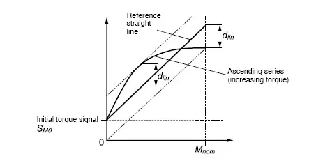 為了確定線性誤差,負(fù)載需要從零增加到額定扭矩并進(jìn)行了一系列測(cè)量。基準(zhǔn)直線是穿過(guò)初始點(diǎn)的最佳擬合直線。規(guī)定的線性偏差是實(shí)際輸出信號(hào)與參考直線的最大偏差。也可以描述為公差帶(偏離直線的上下偏差量之和)寬度的一半,該寬度與基準(zhǔn)直線對(duì)稱。
