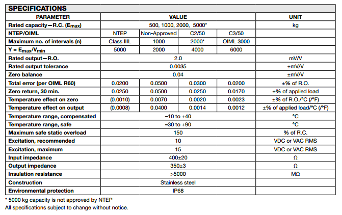 美國特迪亞tedea 620稱重傳感器系列所有量程如下:do9廣州南創電子科技有限公司
