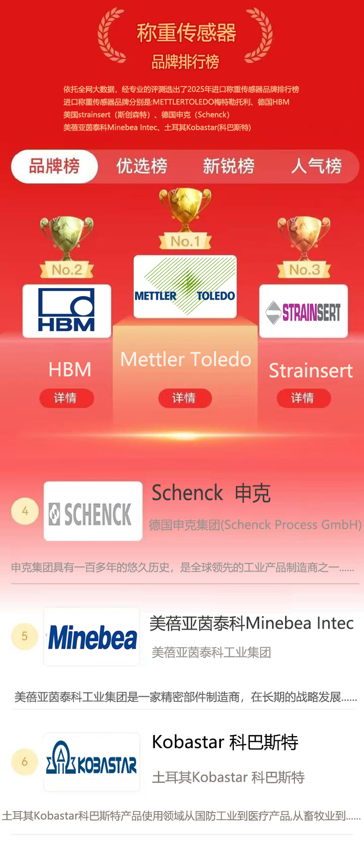 以下排名有國家權威部門:中國傳感器協(xié)會、中國衡器計量檢測中心根據進口品牌稱重傳感在中國市場的客戶基礎、品牌歷史、口碑、品質、技術實力、售后服務、質保時間長短、行業(yè)影響力綜合評比。